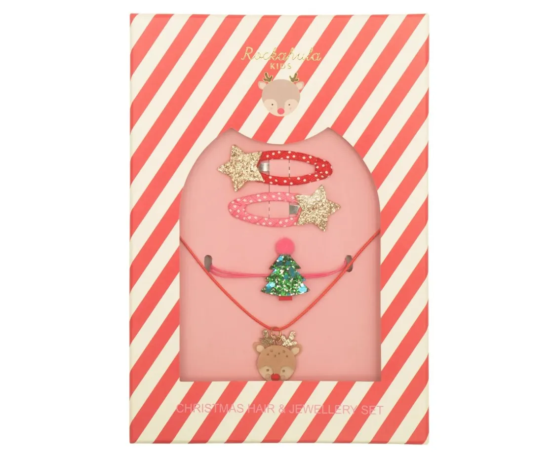 El set navideño de Rockahula incluye dos clips de estrella con purpurina dorada, un collar de reno y una pulsera con forma de arbolito de Navidad. Accesorios ideales para llevar en estas fiestas tan señaladas y completar tu look más navideño.