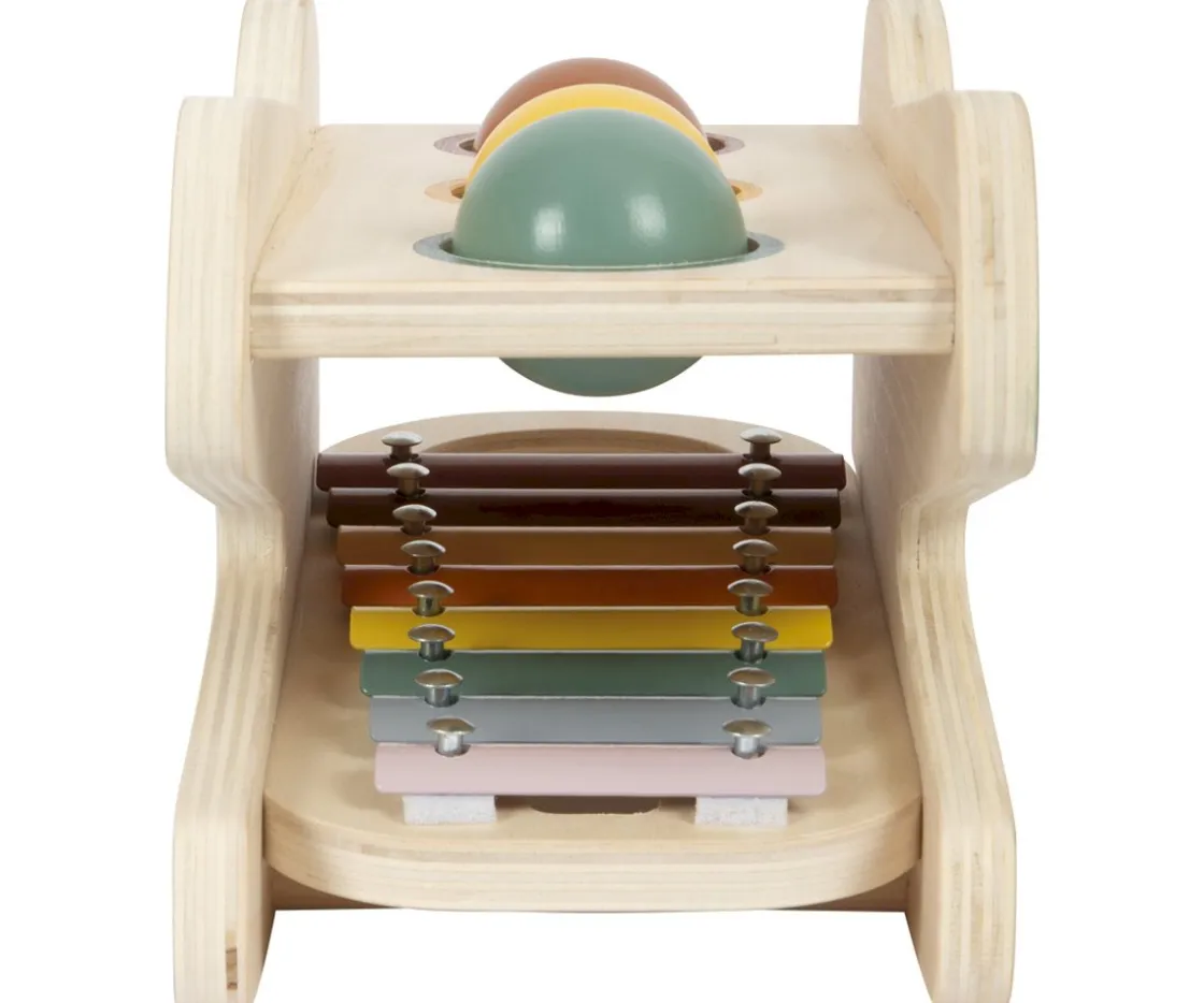 - Las ruedas caen al golpearlas por debajo del xilófono y crea diferentes sonidos