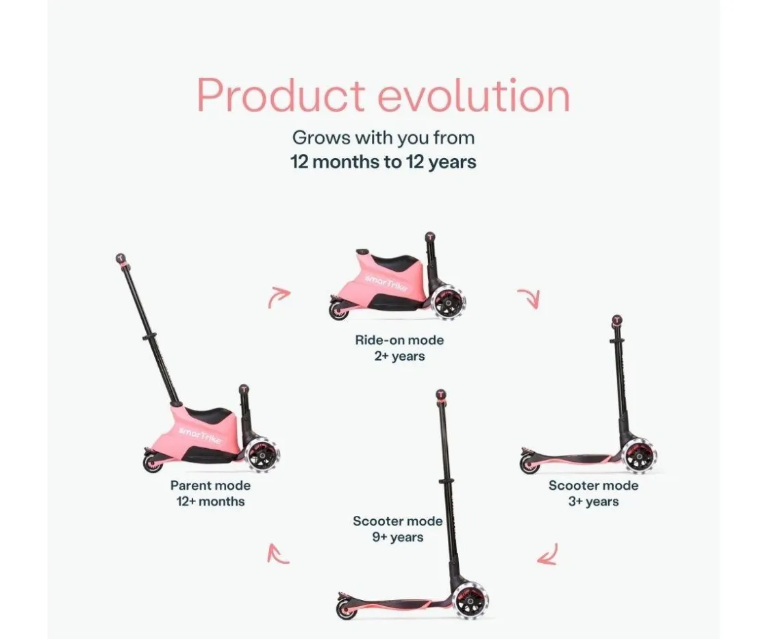Comienza usando este patinete como un vehículo dirigido por los padres. Cuando tu peque sea más independiente conviértelo en scooter para que empuje con sus piernas, posteriormente lo puedes transformar en un patinete con manillar extensible.
