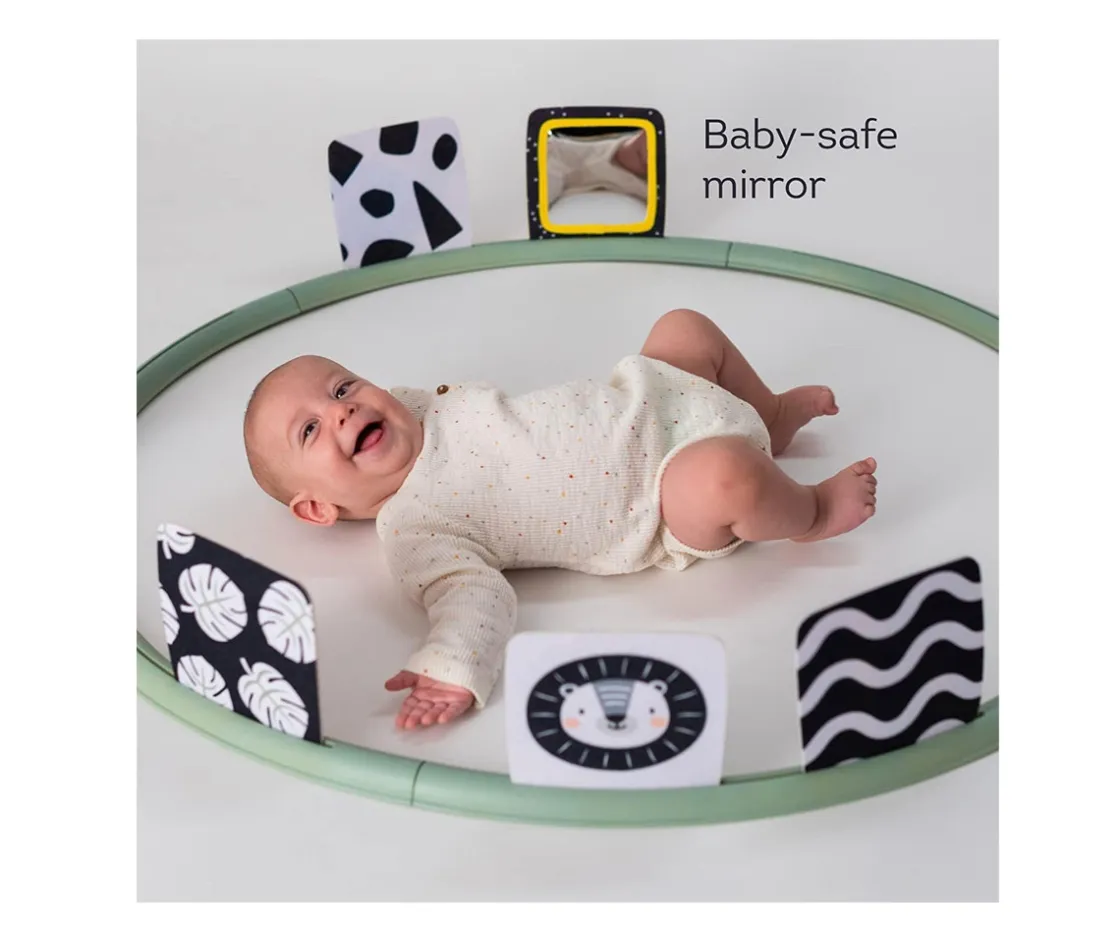 - Etapa 1 (0-2m): Con almohada boca abajo, espejo seguro para bebés y cinco tarjetas de arte de fieltro con ilustraciones de alto contraste para promover la visión del bebé mientras practica el tiempo boca abajo