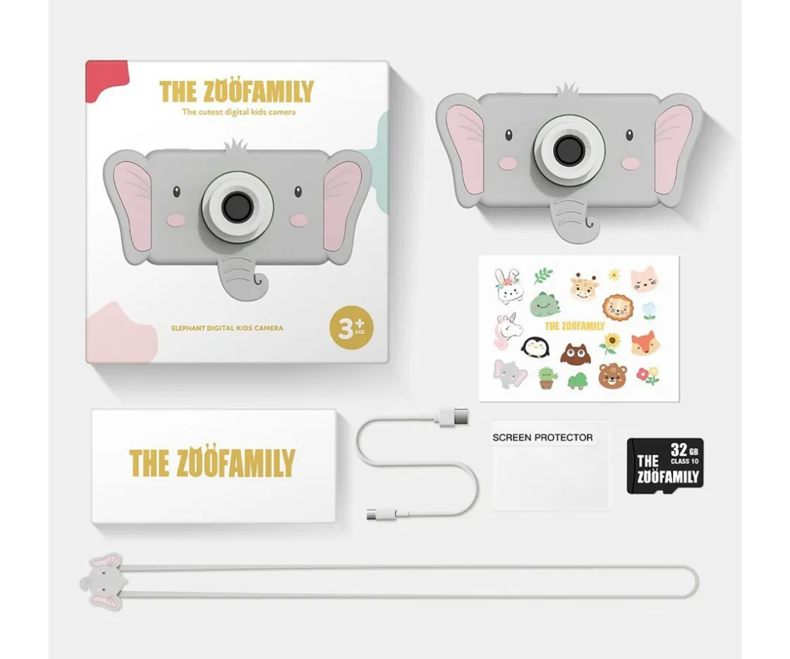 La cámara digital para niños Zoo Friends de The Zoofamily con 32 megapíxeles y grabadora de vídeo, tiene un adorable diseño de elefante. Es pequeña, pesa poco e incluye más de 20 filtros y marcos digitales. La cubierta de silicona es ecológica, protege contra caídas y es fácil de lavar. La batería recargable permite realizar más de 2000 fotos o grabar hasta 4 horas con una carga completa.