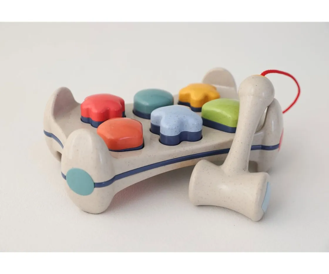 Incluye un martillo unido al banco por una cuerdecita para que los peques puedan martillar las formas. Cada forma emite un sonido al moverlas o agitarlas.