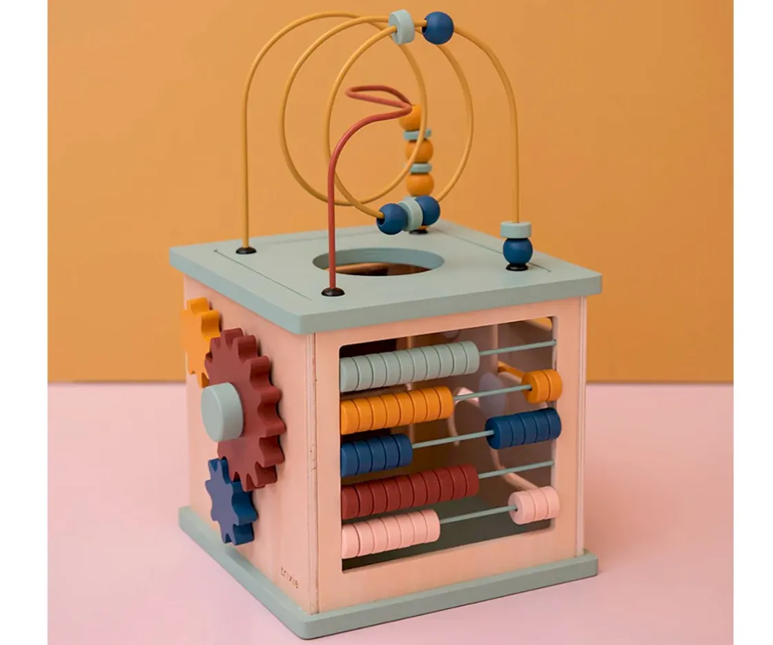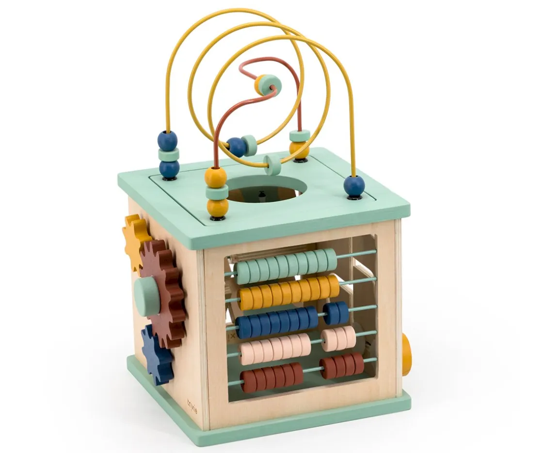 También incluye un ábaco para jugar a contar y un conjunto de engranajes para girar.