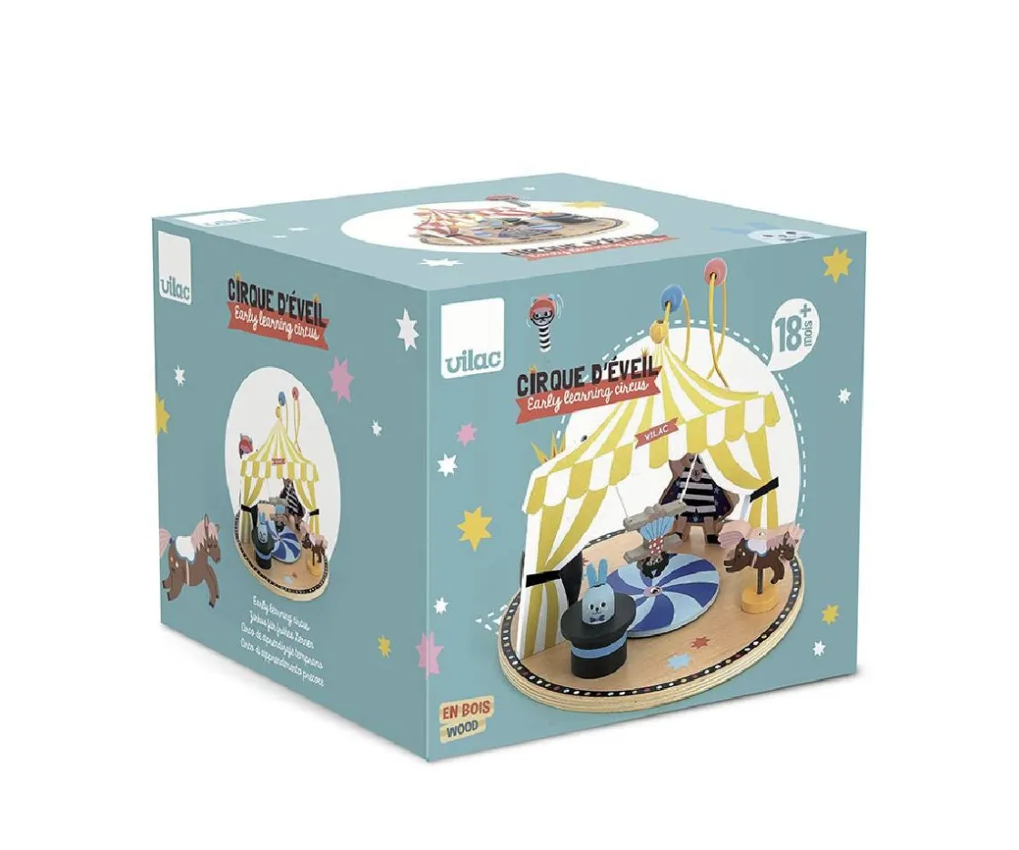 - Incluye: base circo madera y 6 actividades: pop-up, alambre metálico, conejito chillón, ruleta de ilusión óptica, caballo de resorte, acróbata de cuerda floja