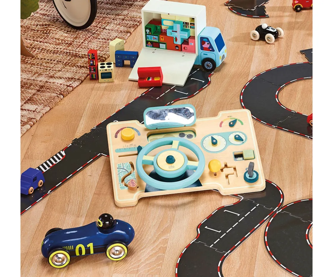 El tablero multiactividad de Vilac ofrece un sinfín de juegos para los más pequeños: girar el volante, consultar el GPS, mirar en el retrovisor, cambiar de marcha o accionar los indicadores con sonido.