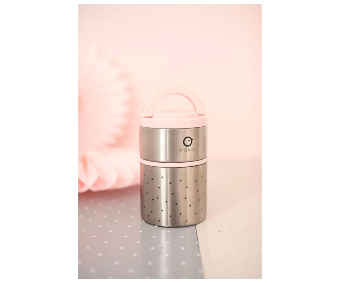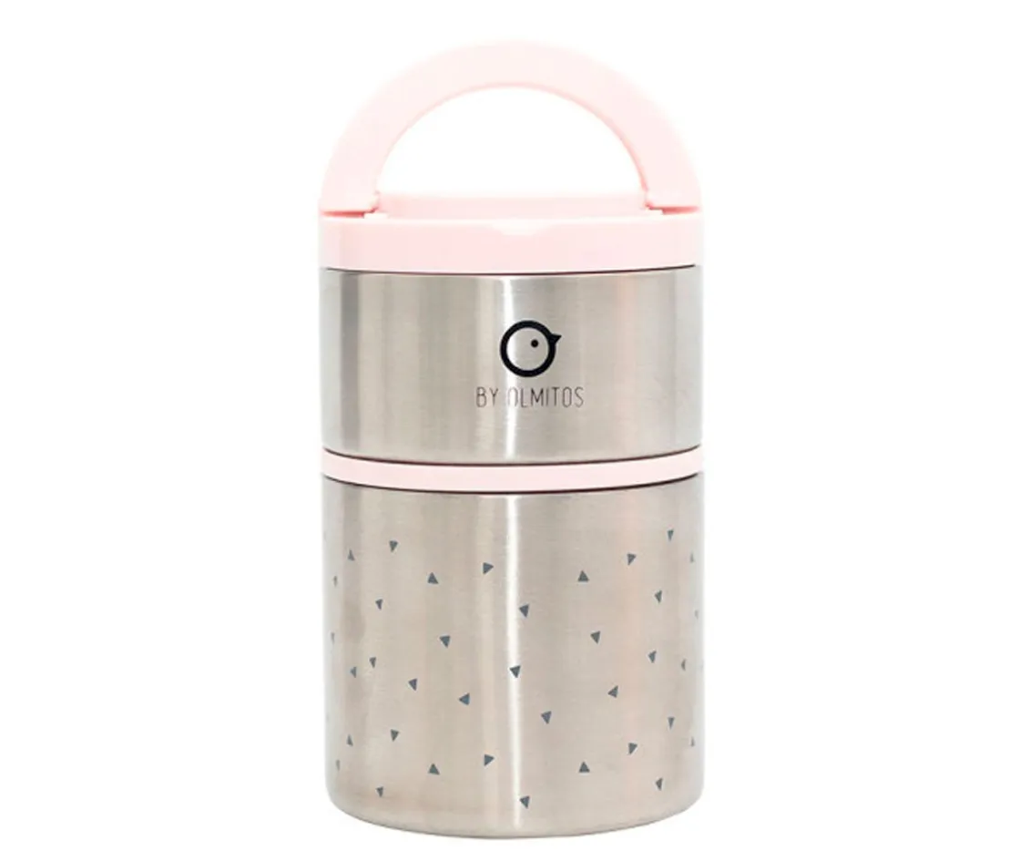 Incluye dos compartimentos, tapa con aro de silicona y asa para transportarlo fácilmente.