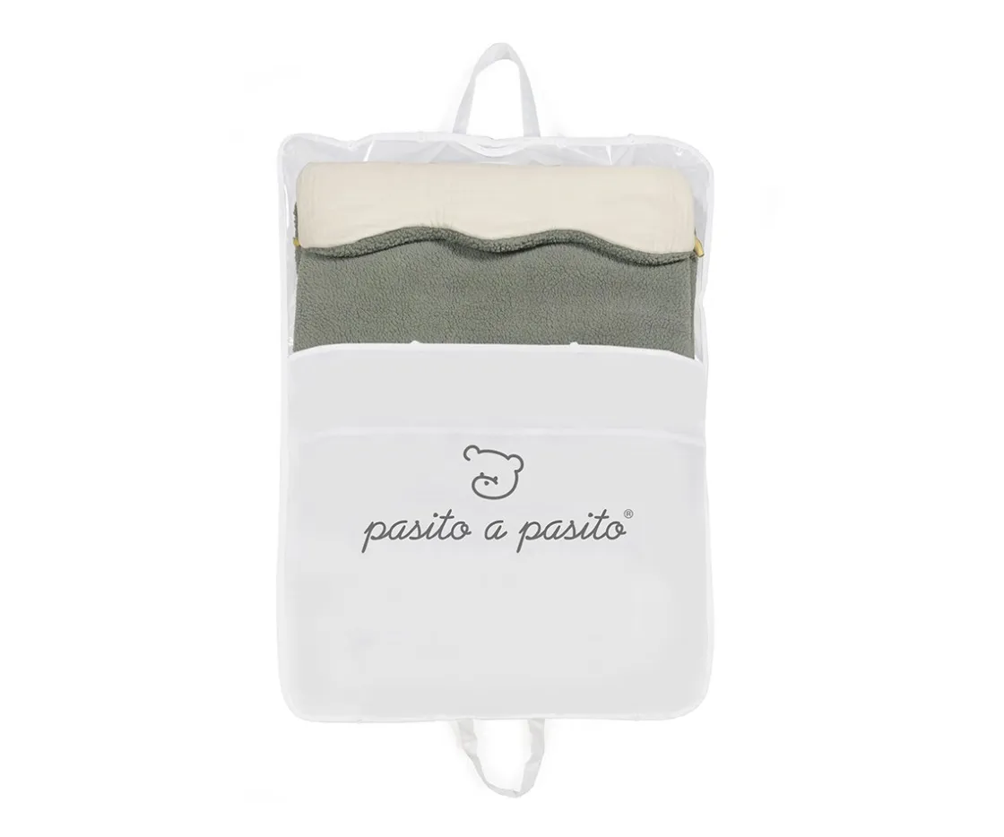 El saco cuco Paddington de Pasito a Pasito, es un saco de dormir para bebé elaborado en borreguito verde y bambula beige muy suave.