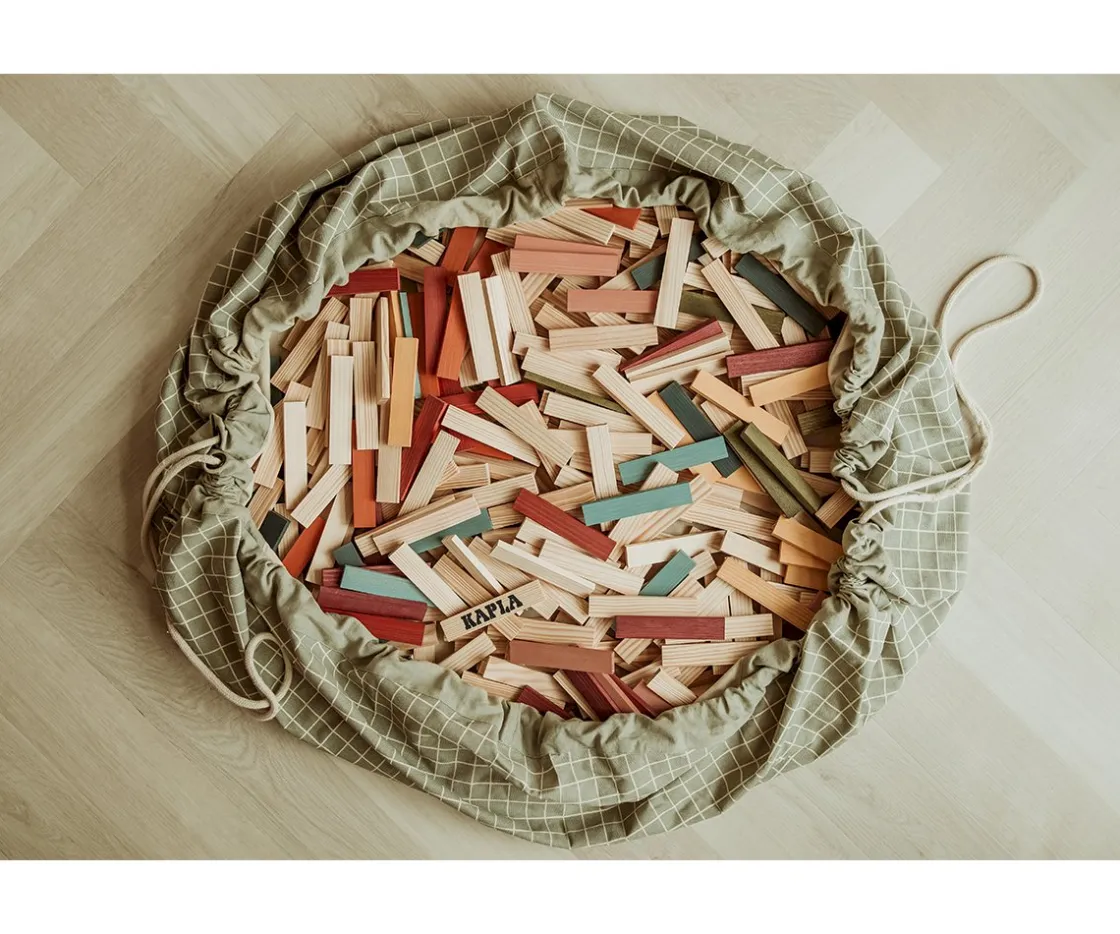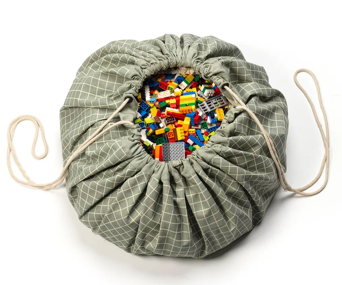 Este saco se desdobla y se convierte en una manta de juegos donde el niño puede jugar con todas sus juguetes, grandes y pequeños, y cuando llega la hora de acostarse, sólo hay que cerrarla y ya está todo recogido.