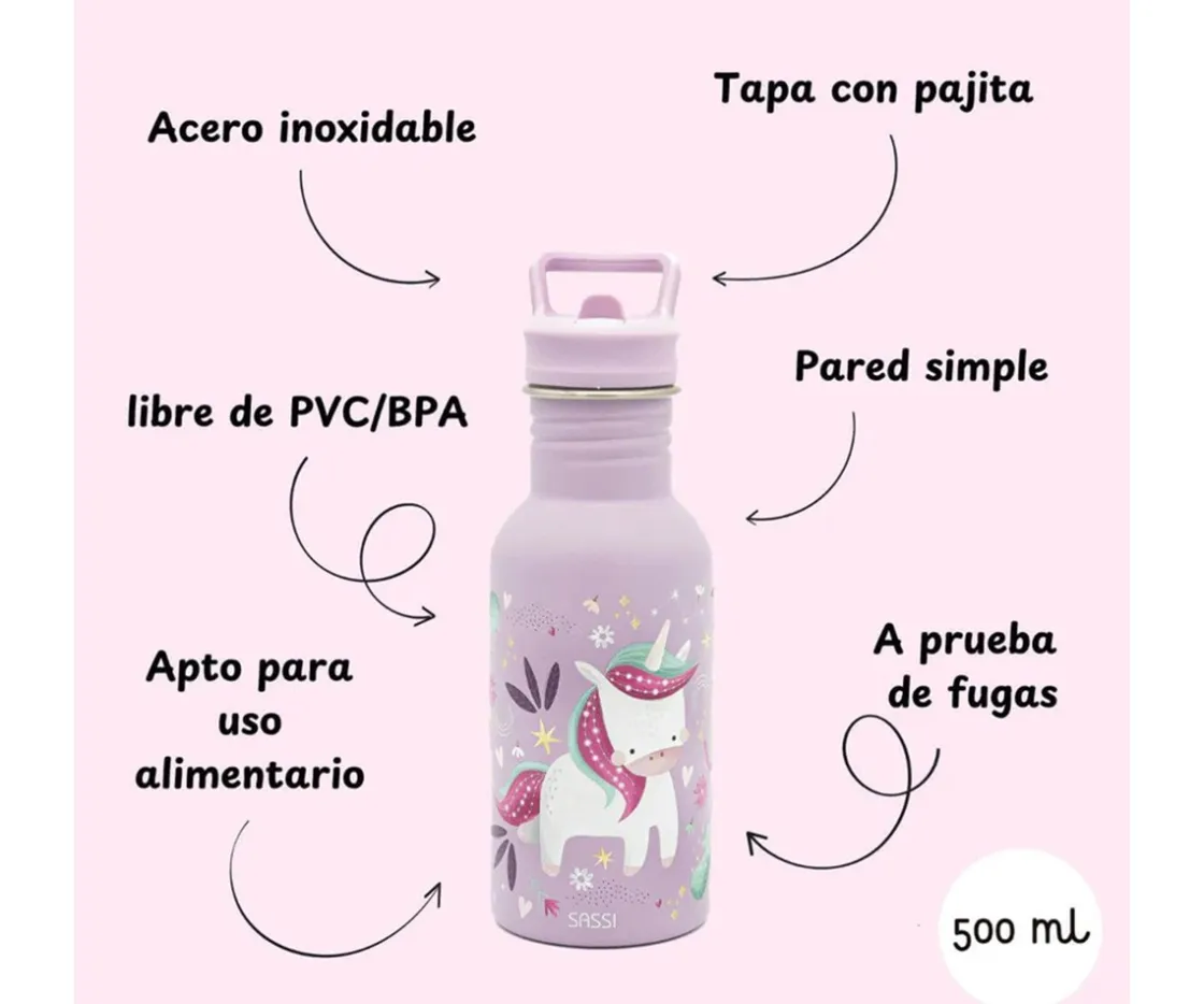 Estan fabricadas en acero inoxidable, que las hace ligeras y fáciles de transportar, y cuentan con una pajita extraíble que permite a los peques beber fácil y cómodamente.