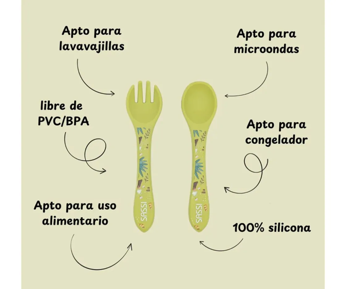 Un tenedor y una cuchara de silicona con forma redondeada, flexibles y agradables al tacto ideales para acompañar a los peques en sus primeros contactos con la comida sólida de forma autónoma.
