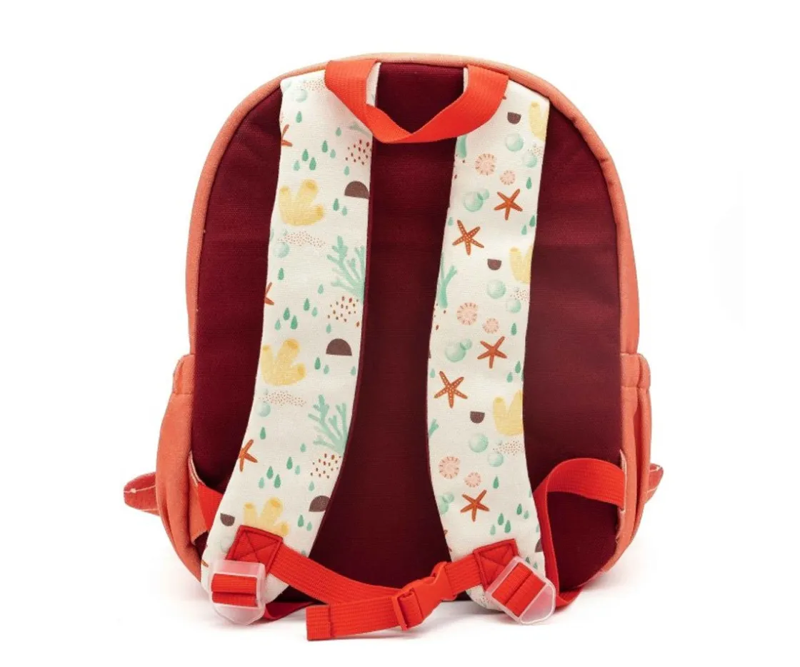 La mochila escolar Sassi cuenta con bolsillos exteriores para la botella de agua, un bolsillo interior para objetos más pequeños y una etiqueta en el interior para escribir el nombre.