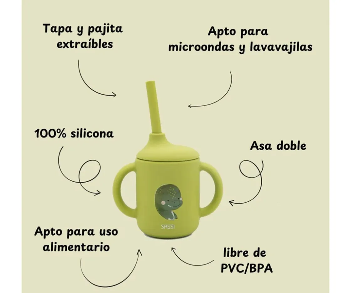 Comenzar a beber de forma independiente será muy divertido y seguro con la taza de silicona con asas y pajita de Sassi.