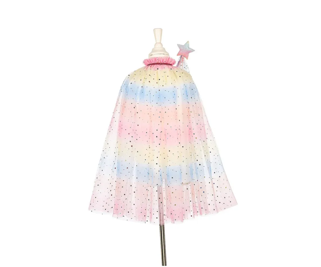 El set incluye una capa brillante, una tiara decorada y una varita mágica: la capa se ajusta fácilmente con un lazo de satén para una sujeción cómoda, la tiara está adornada con flores de colores y una elegante figura de unicornio, la varita tiene una estrella centelleante y cintas satinadas para un toque aún más mágico.
