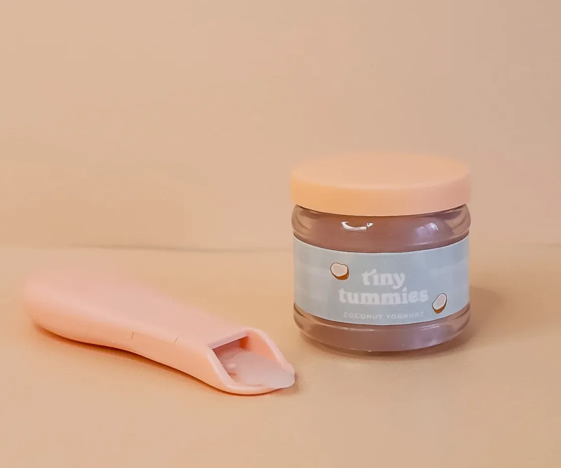 El set incluye una cuchara mágica y un tarro de yogur de coco. La cuchara está especialmente diseñada para introducirla en el yogur, pues incluye comida que desaparece como si tu muñeca se lo hubiera comido.