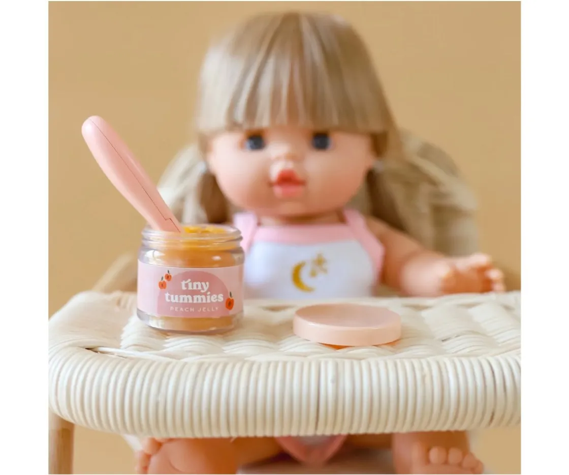El set incluye una cuchara mágica y un tarro de gelatina de melocotón. La cuchara está especialmente diseñada para introducirla en el tarro, pues incluye comida que desaparece como si tu muñeca se lo hubiera comido.