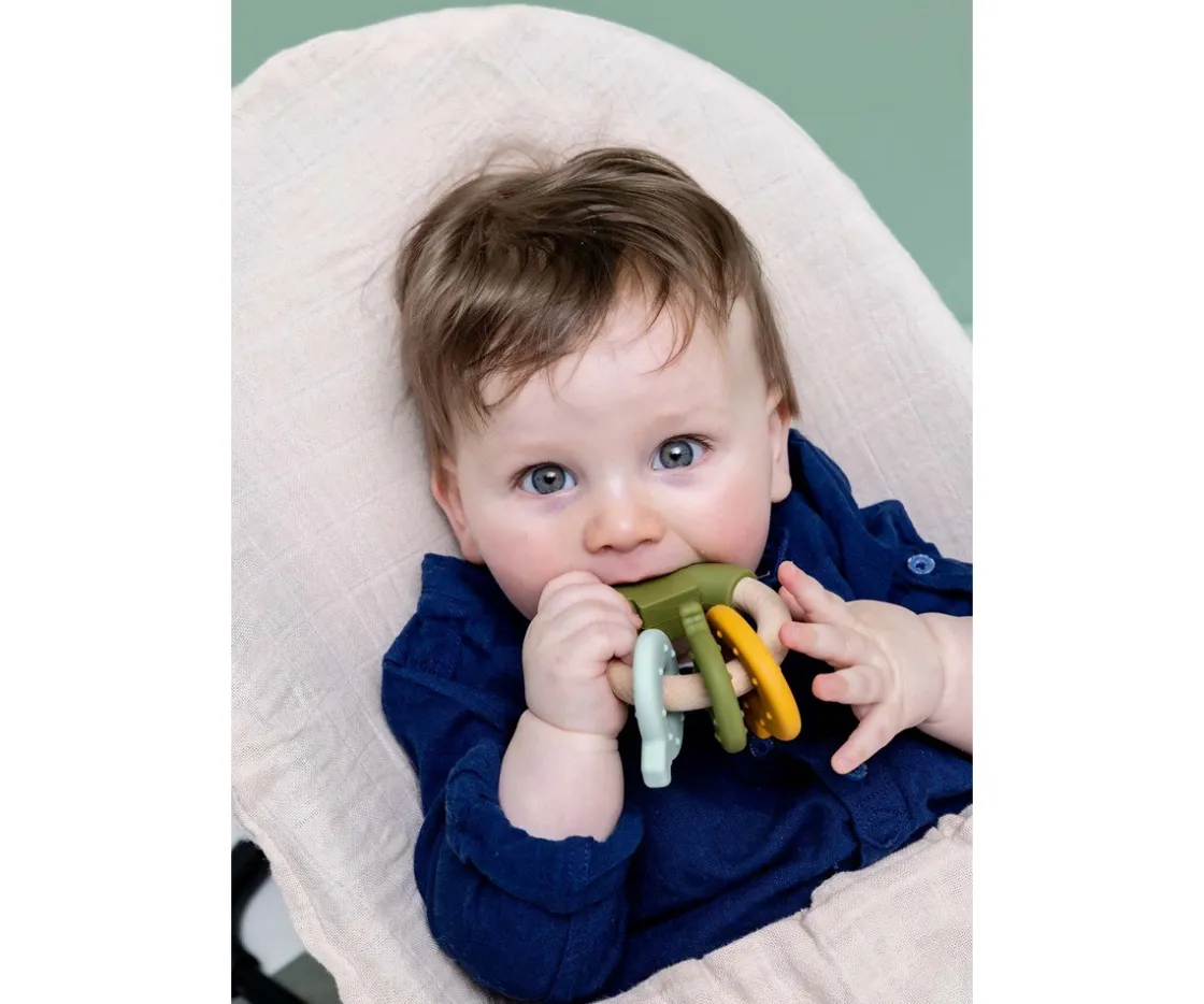 Este anilla de actividades con llaves de silicona de Tixie está diseñado para bebés desde 0 meses en adelante, perfecto para estimular la motricidad fina y calmar las molestias durante el proceso de dentición.