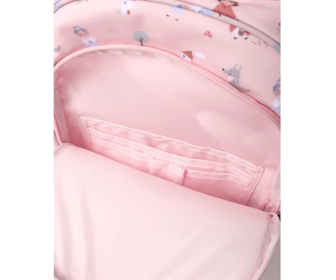 - Un bolsillo frontal, que ocupa casi la altura de la mochila, con múltiples separadores interiores donde guardar lápices,cubiertos y pequeños artículos, que los peques tendrán más accesible