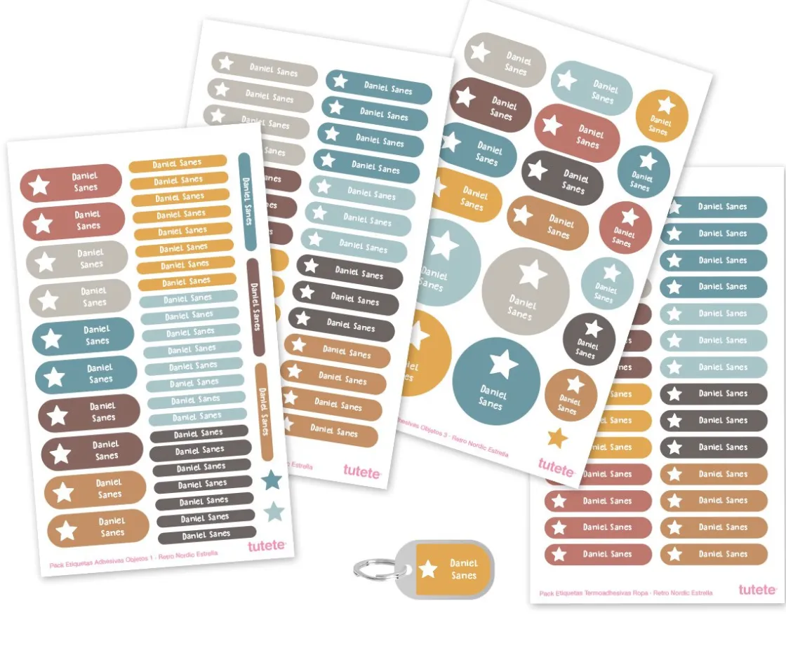 Tutete trae este pack súper práctico formado por un Sello Personalizado Gran Estrella con el nombre de tu peque y el pack Combinado Termo y Pegatinas Retro Nordic Estrella.