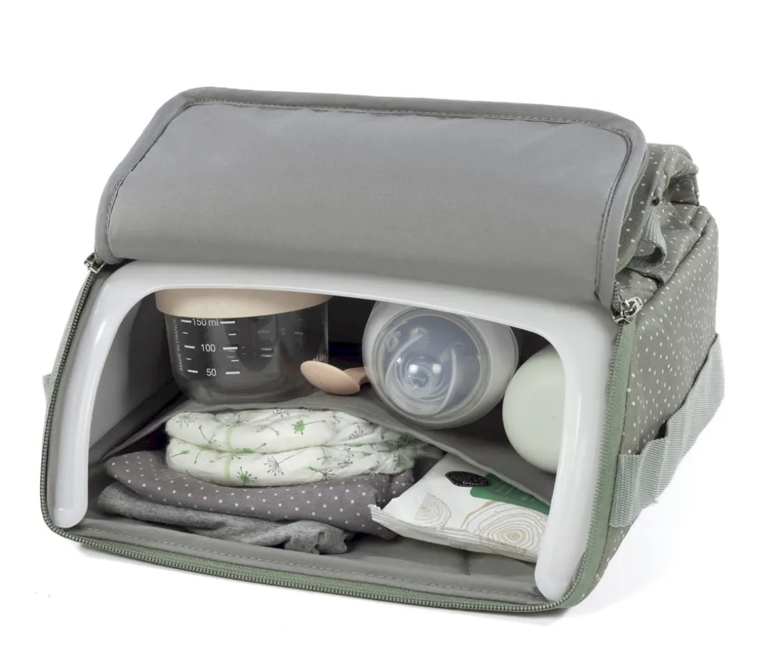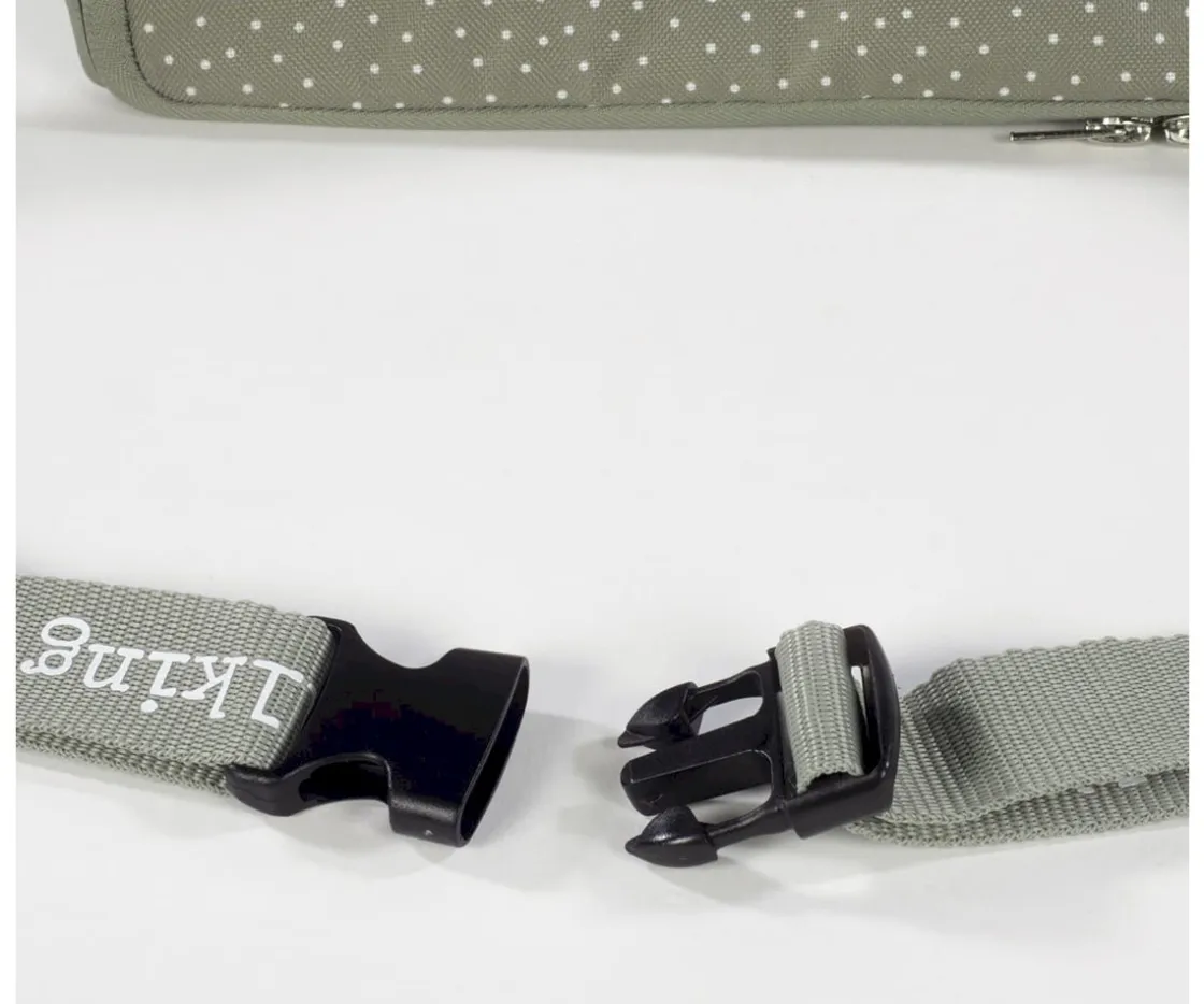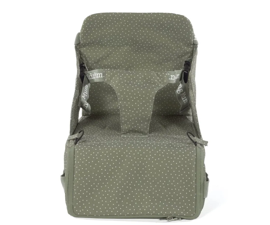Trona portátil de la colección lunares Poppy Musgo de Walking Mum con función 2 en 1: asiento elevador y bolsa de almacenaje con asa para colgar del hombro.