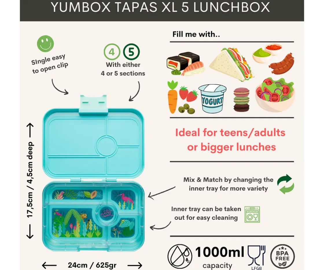La diferencia del tamaño Tapas es que las bandejas son intercambiables. Esto significa que puedes comprar una bandeja adicional y elegir entre tener 4 o 5 compartimentos, según tus necesidades.