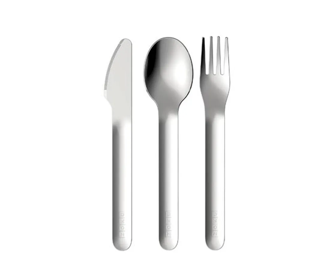 Set de cubiertos de acero inoxidable perfectos para el momento de la comida en cualquier parte. Puedes guardarlos cómodamente en su práctico estuche, en el que quedan perfectamente encajados gracias a la pieza de silicona que los envuelve.