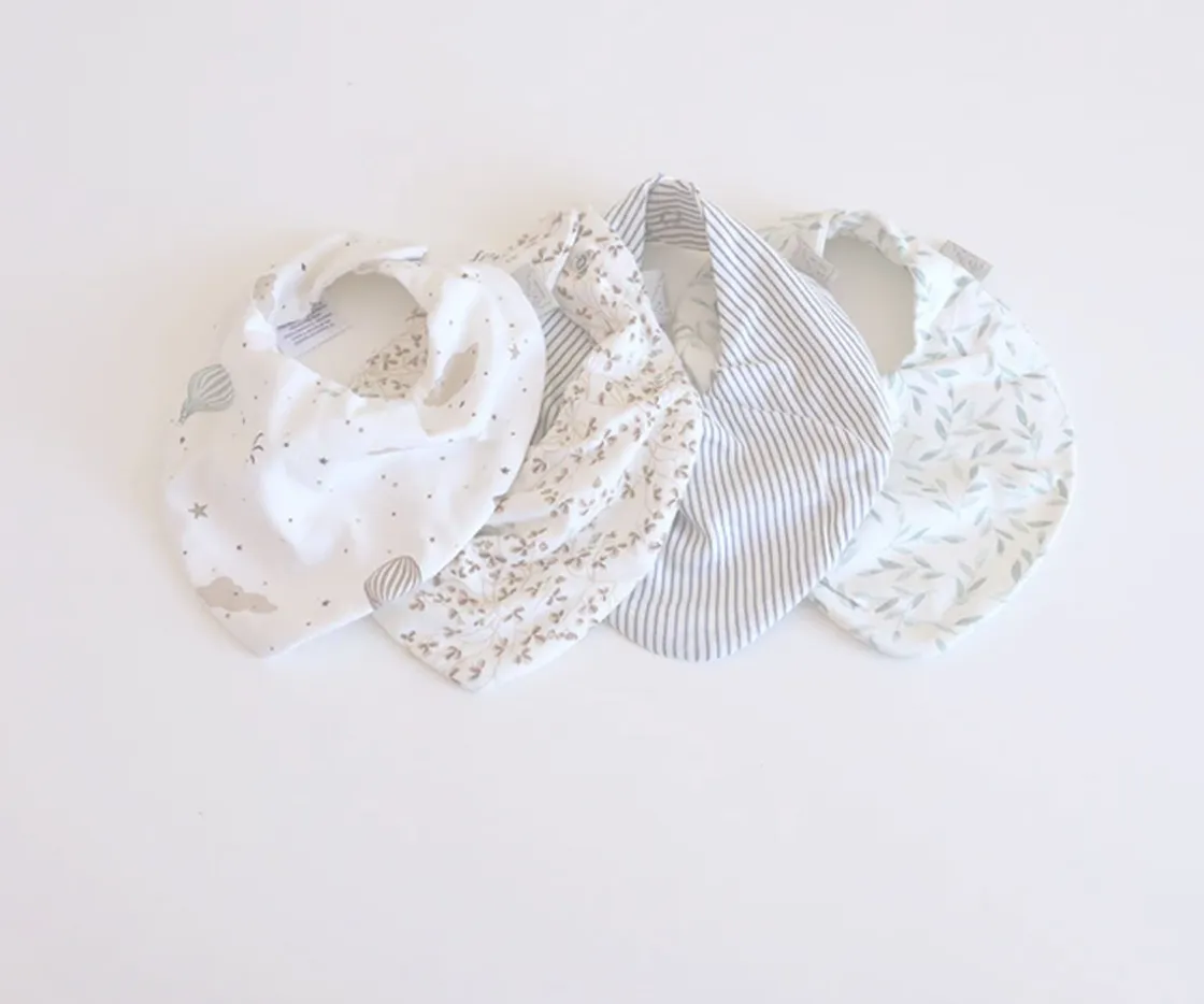 Este babero de algodón orgánico, diseñado para el día a día, ofrece un toque de estilo y versatilidad. Cuenta con dos botones para un ajuste adaptable y está disponible en una variedad de estampados y colores lisos. La versión en tonos azules y blanco es una opción elegante.