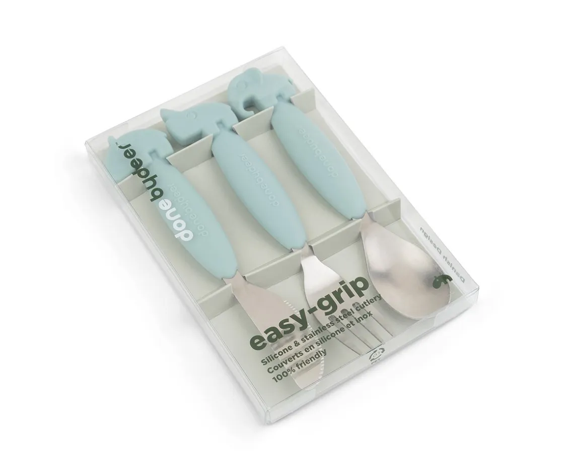 Set de cubiertos compuestos con cuchara, cuhillo y tenedor de silicona para un sencillo agarre para manos más pequeñas