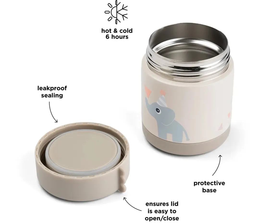 El termo para alimentos sólidos o purés de Done by Deer es de acero inoxidable y mantiene la comida caliente o fría hasta por 6 horas, con un cambio gradual de temperatura con el tiempo.