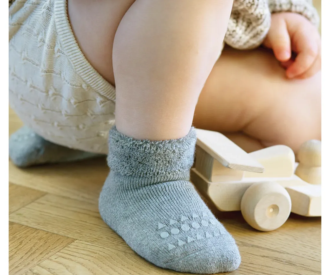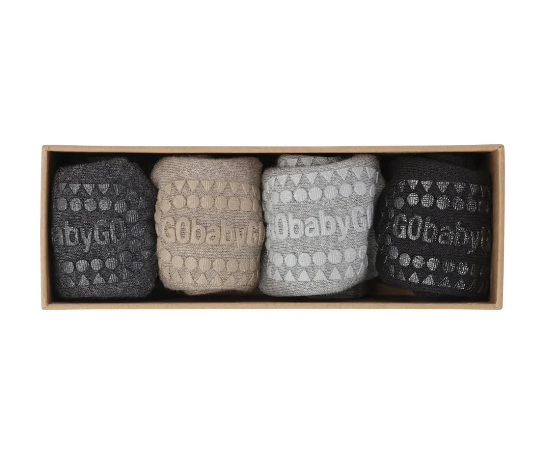 Combo Box con 4 pares de calcetines hechos de rizo de algodón orgánico, transpirables y de textura suave para que los peques puedan usarlos en sitios donde no necesiten llevar zapatos.