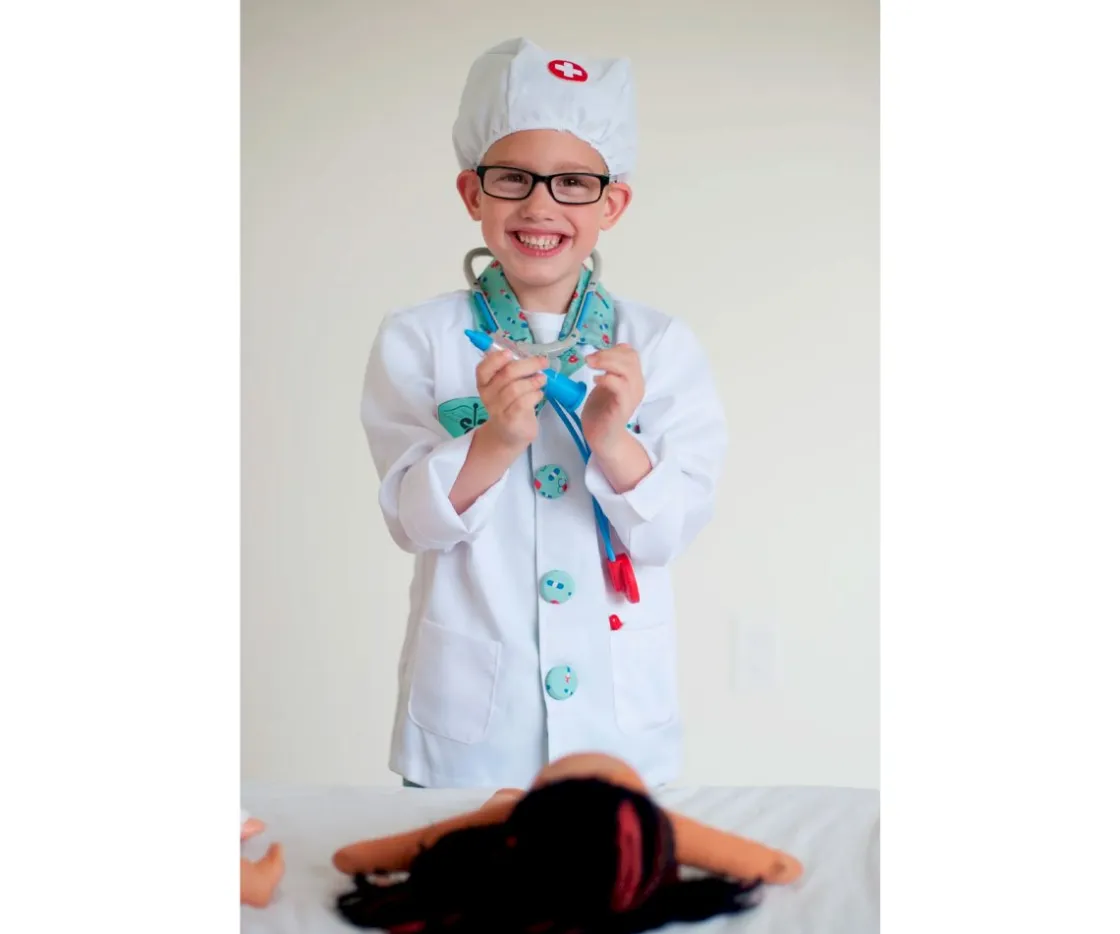 - Incluye: bata de laboratorio, pantalones, máscara, sombrero, estetoscopio,jeringa,etiqueta con el nombre y termómetro