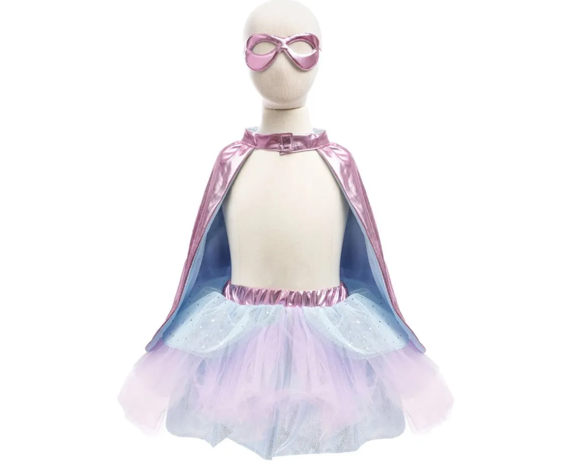 La capa metálica de rosa está forrada con satén azul, el tutú tiene un cintura metálica en rosa,estrellas impresas y capas de tul azul y rosa. El antifaz metálico rosa a juego permitirá que nadie pueda reconocer a este superhéroe.