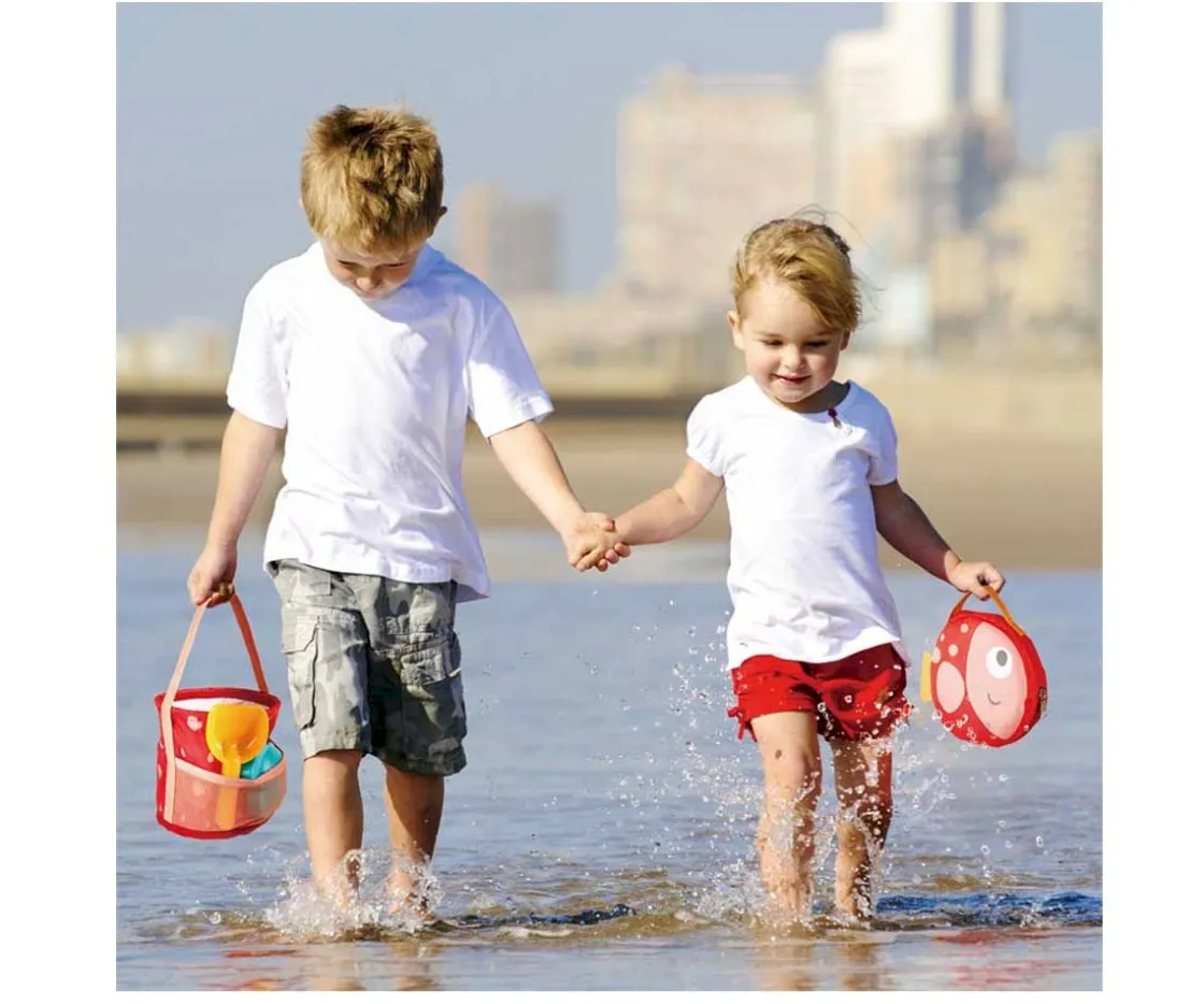 ¡Prepárate para el verano con este adorable set de playa! Su bolsa plana con forma de pez es fácil de transportar para los más peques y además contiene un cubo plegable, una pala pequeña y un dulce molde de arena con forma de pez