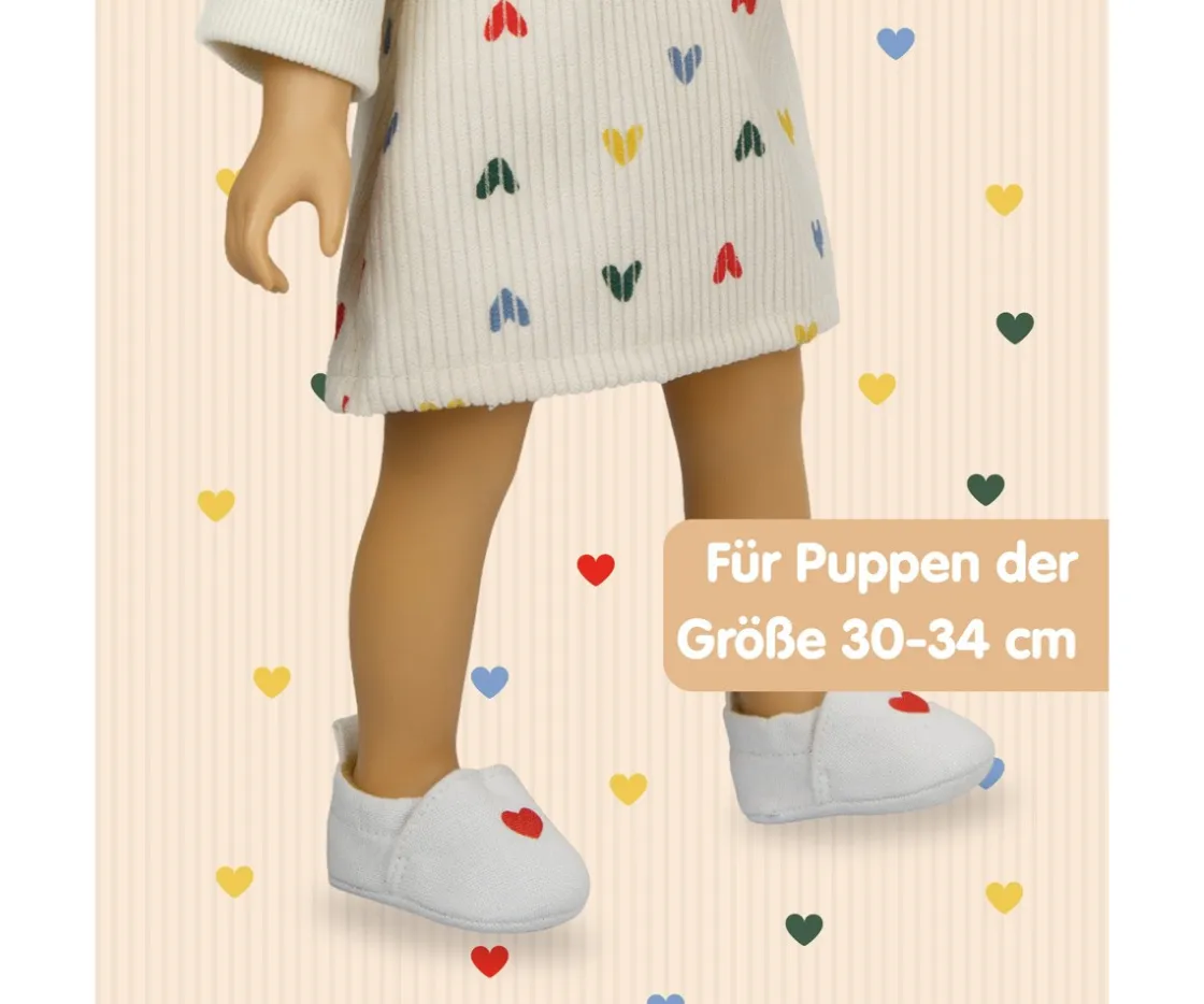 Dale el toque final al look de tu muñeca con las adorables zapatillas con corazón de Heless, diseñadas para muñecas de 30 a 34 cm. Su diseño acogedor y su suave tejido mantienen los «pies» de la muñeca siempre calentitos, mientras su práctica abertura elástica y el tirador trasero permiten que los niños puedan ponerlas y quitarlas con facilidad.