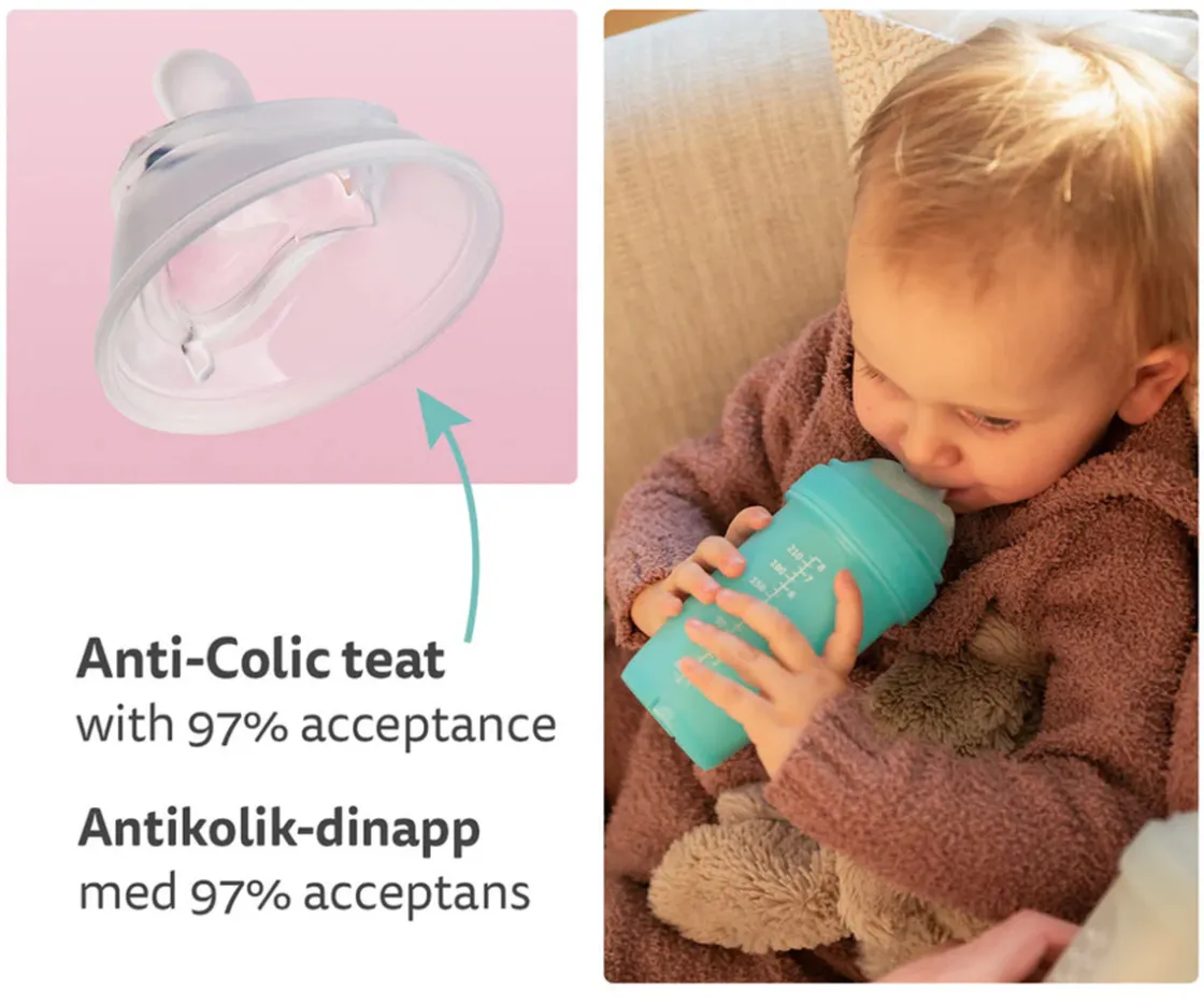 - Doble sistema anticólico. Por su forma, evita que entre aire en la boca del bebé. Reduce gases y cólicos