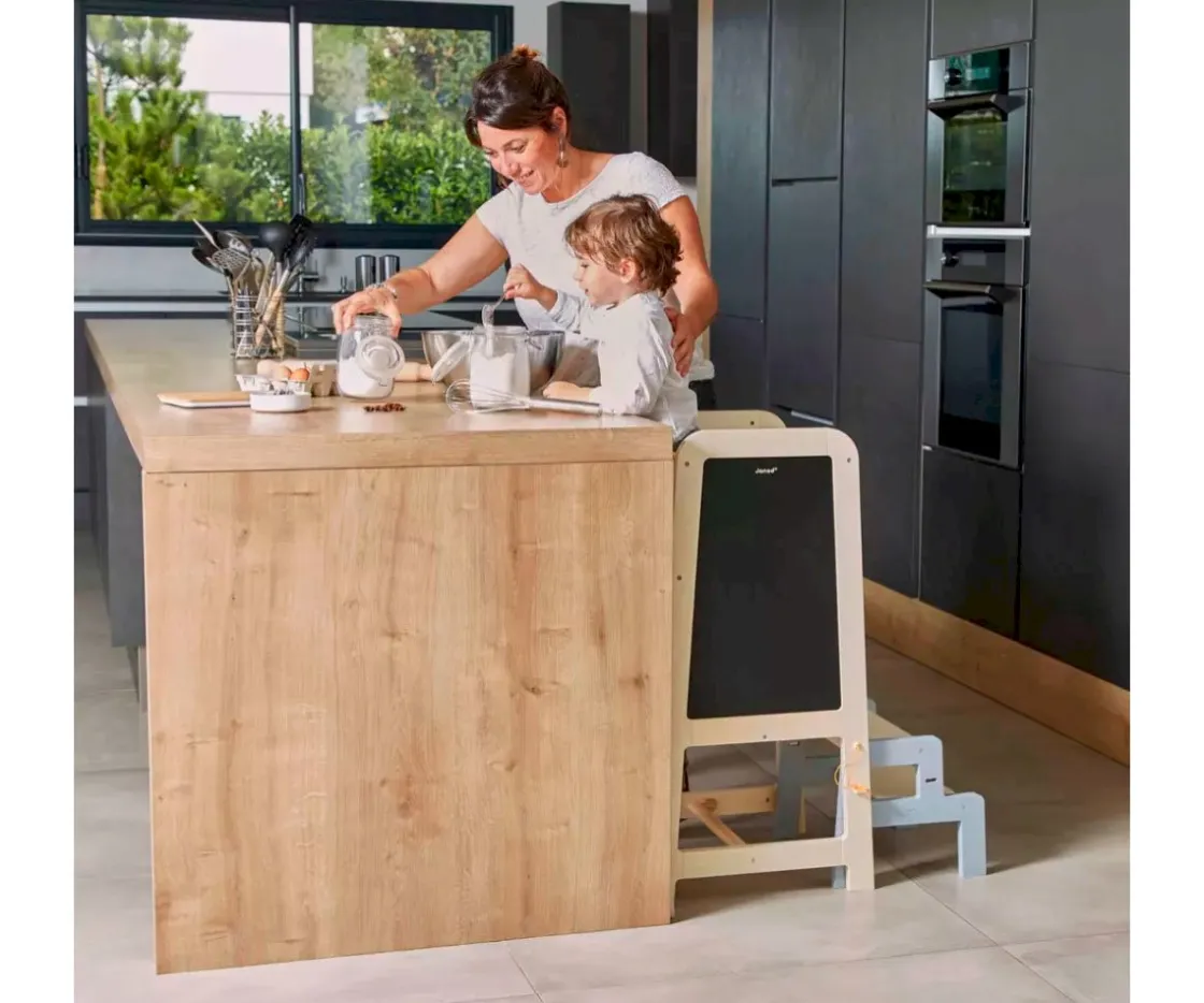 Práctico y pedagógico, este mueble infantil sirve a los más pequeñitos para evitar la frustración al poder situarse a la altura de una mesa o de una encimera y participar en las tareas cotidianas.