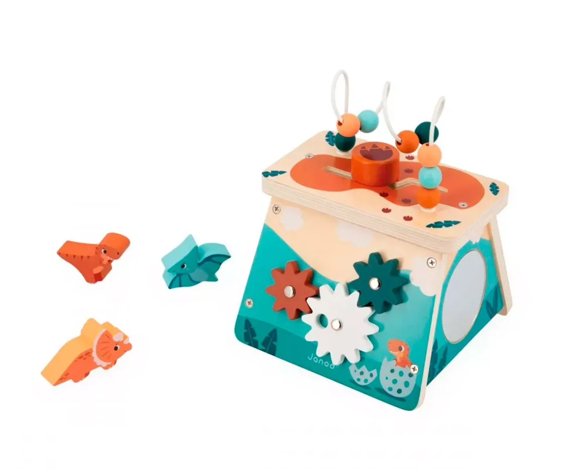 - Incluye: espejo, engranajes, laberinto con 8 cuentas de madera, 3 dinosaurios encajables y muchas más actividades
