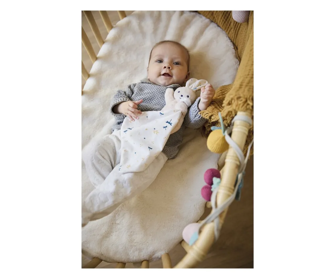 Este precioso conejito blanco envuelto en una mantita cuadrada será el mejor compañero de los más peques