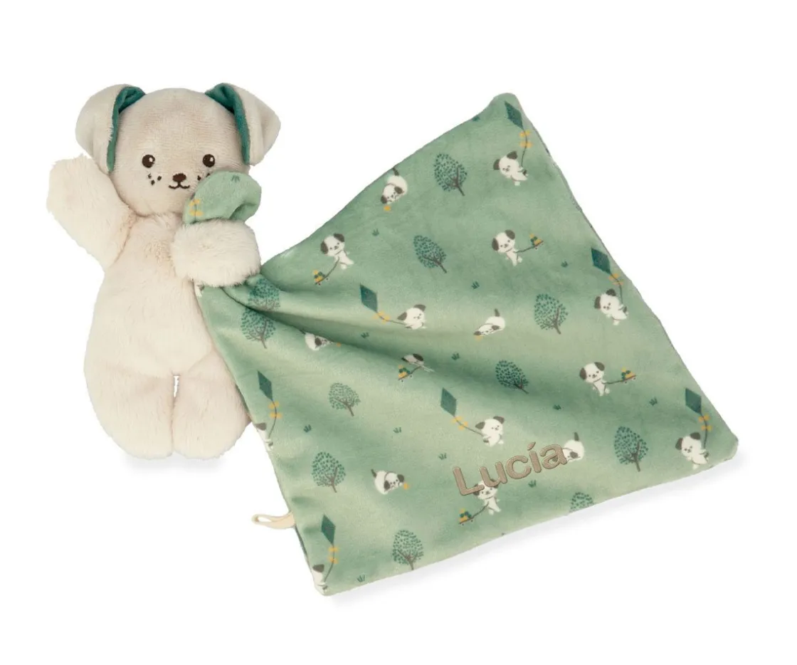 Este precioso perrito de Kaloo está envuelto en una mantita cuadrada y será el mejor compañero de juegos y sueños de los más peques.