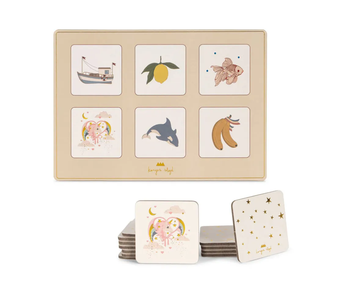 - Incluye: 6 tablero de juego y 36 fichas ilustradas a mano con adorables diseños de Konges Slojd