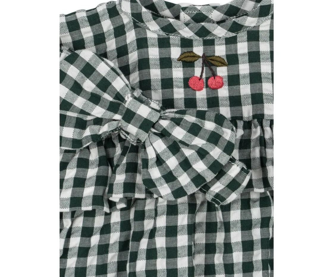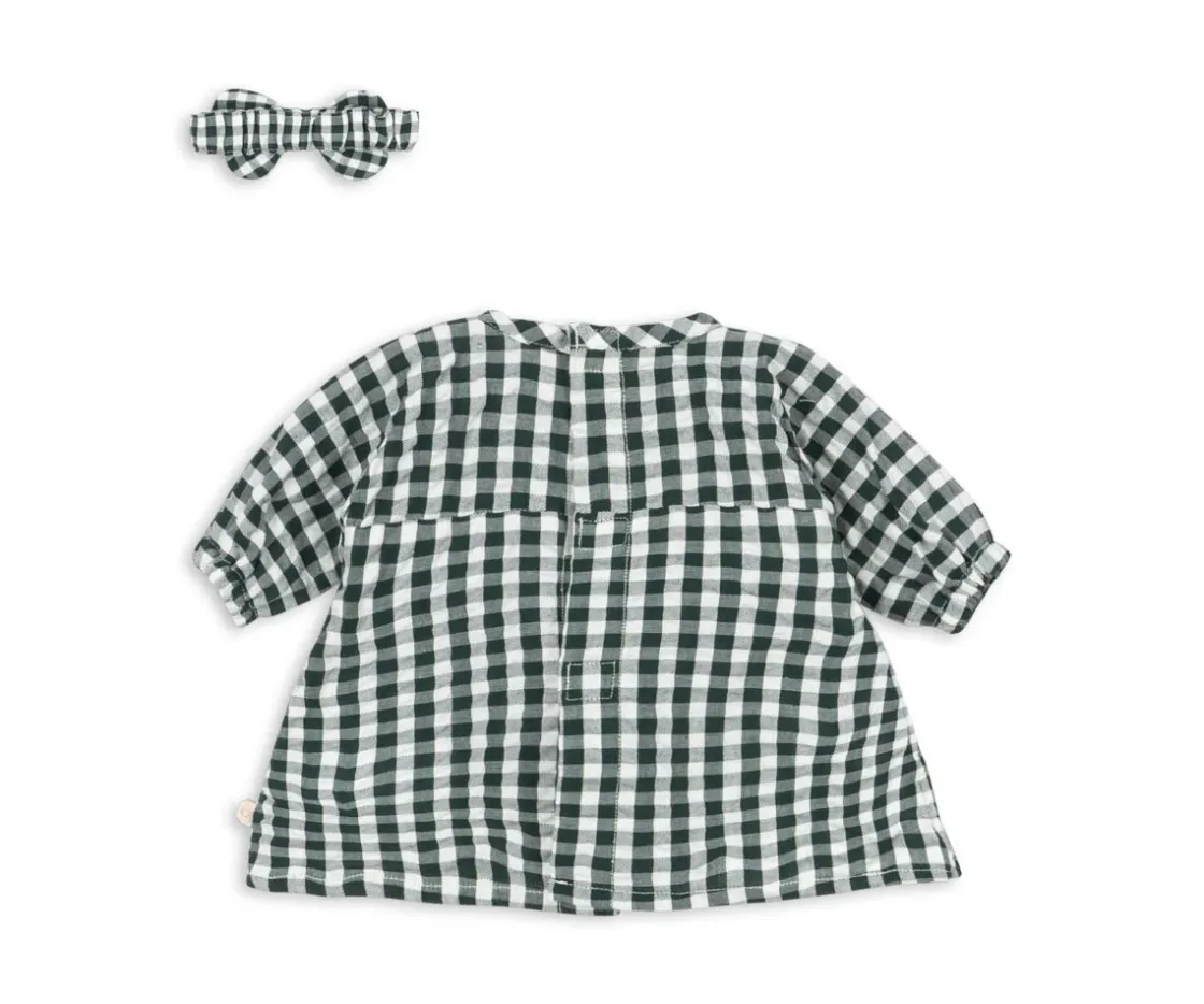 Viste a tu muñeco con este bonito y dulce vestido de suave algodón, con estampado de cuadros vichy verdes, un precioso volante bajo el pecho y su lacito a juego para la cabeza.