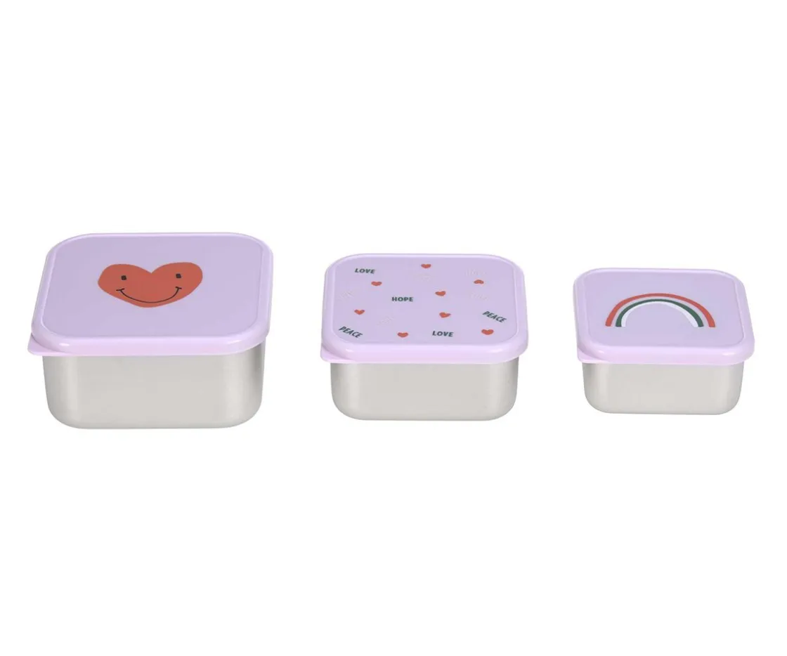 Set de 3 cajas de almuerzo de la colección Happy Heart Lavender de Lassig, para llevar pequeños snack al cole. Además se pueden apilar una dentro de otra, cuando no estén en uso, y ahorrar espacio.