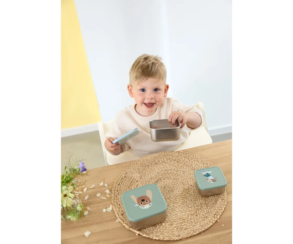 El set de 3 cajas con base de acero inoxidable de LÄSSIG para llevar fruta, verdura y pequeños snacks son ideales para llevar contigo al cole, de excursión o al parque.