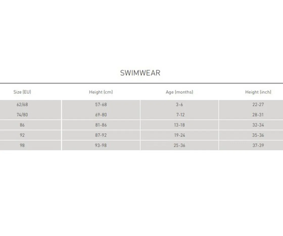 - ATENCIÓN: El uso de este bañador no sustituye jamás el uso de crema protectora y se debe de evitar la exposición solar del niño entre las horas en que el sol está en su punto más álgido