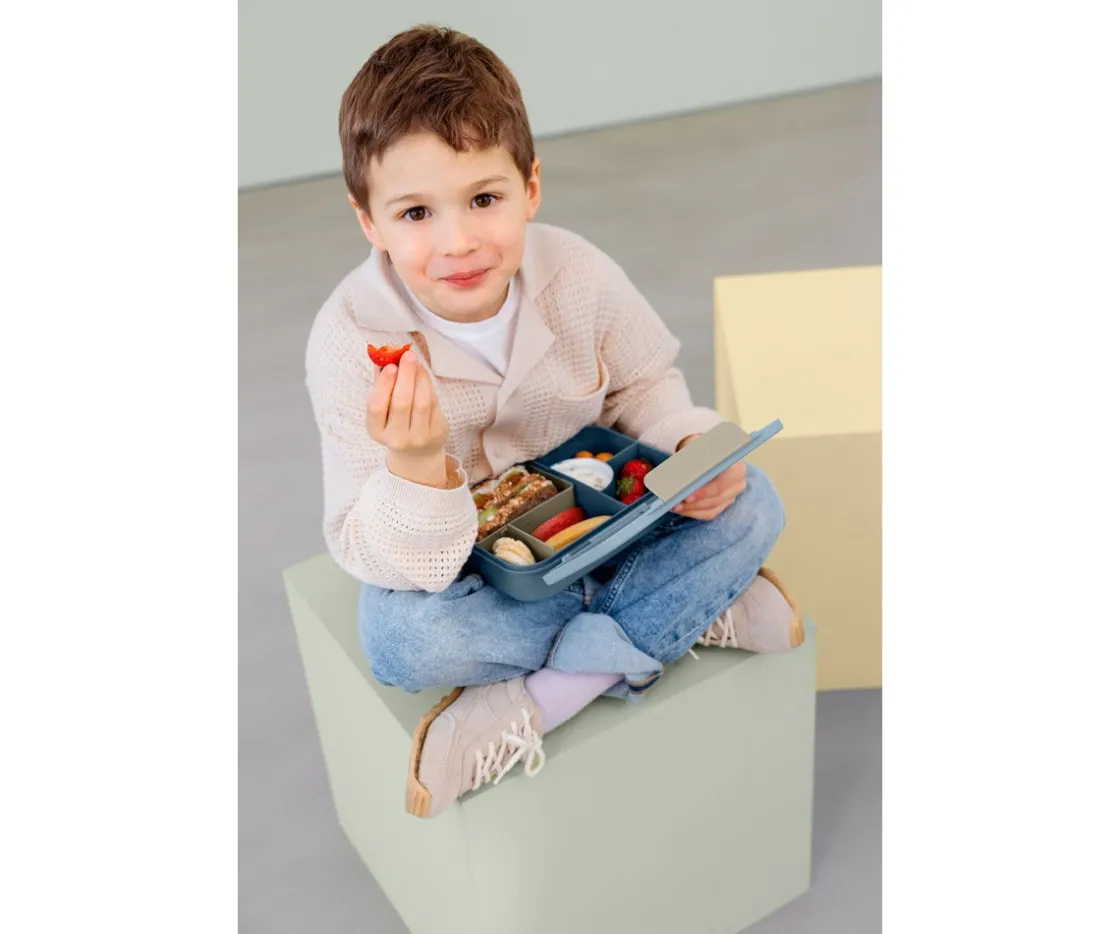 Caja de almuerzo de la colección Pattern Party de LÄSSIG. En su interior tiene 4 compartimentos fijos y 2 accesorios adicionales extraíbles para dividir los espacios, ideal para llevar al cole, de excursión o al parque. El compartimento central es perfecto para salsas o yogur, gracias a su junta de silicona que evita derrames y mantiene todo separado.