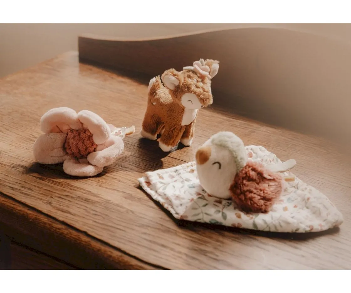 - Incluye: peluche de ciervo, doudou pajarito y mordedor flor