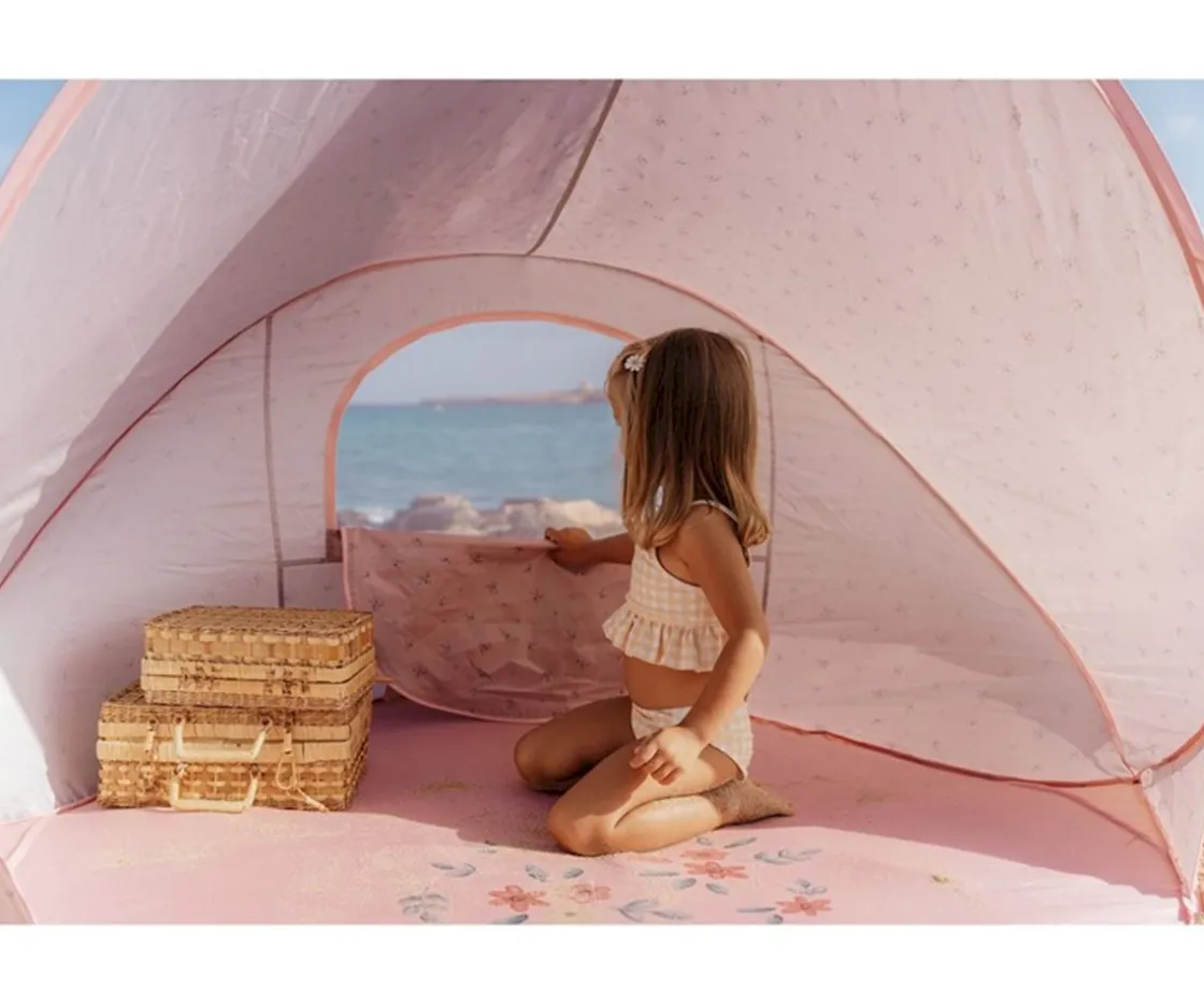Esta bonita carpa de playa con protección UV40 de la colección Ocean Dreams Rosa de Little Dutch, es ideal para los días de playa, aunque también se puede utilizar en piscinas, picnis, parque, jardín y más.
