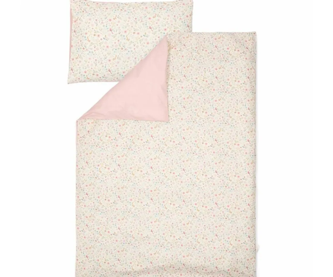 Set de funda nórdica y almohada de la colección Fairy Garden de Little Dutch, fabricado en suave algodón orgánico, transpirable y con certificación Oeko-Tex®. Su diseño reversible combina un lado en color rosa liso y otro con estampado de florecitas. ¡Ideal para el descanso y la imaginación de tu peque!