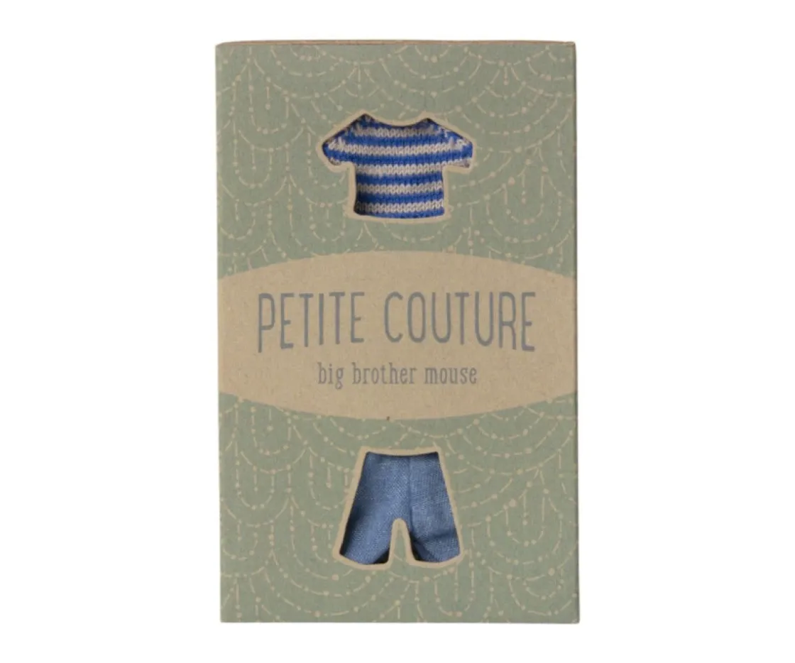 Viste a los ratones hermanos mayores de Maigle con este bonito conjunto formado por jersey de punto con rayas azules y unos vaqueros.