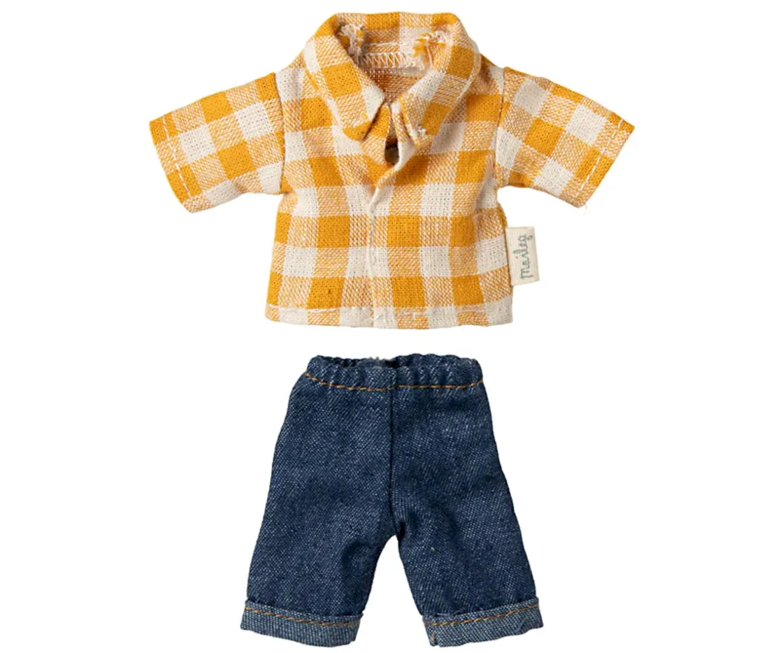Este adorable papá ratón lleva puesta una camisa de cuadros y pantalones vaqueros. Se adapta genial a los muebles y accesorios de tamaño ratón.