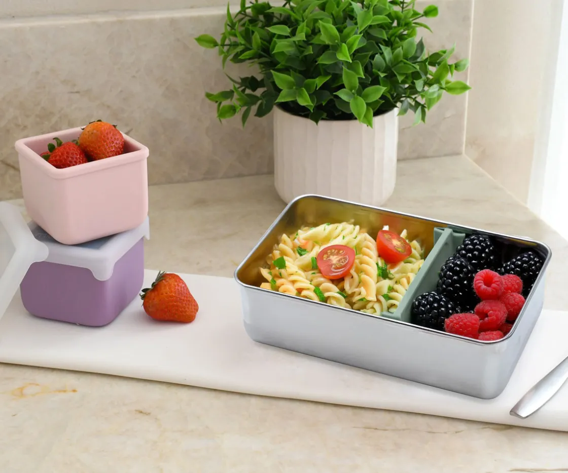 La caja Bento de Acero Inoxidable de Melii combina estilo y sostenibilidad para que preparar las comidas sea más simple que nunca. Su tapa de silicona 100 % de grado alimenticio es completamente hermética, manteniendo la comida fresca y segura.